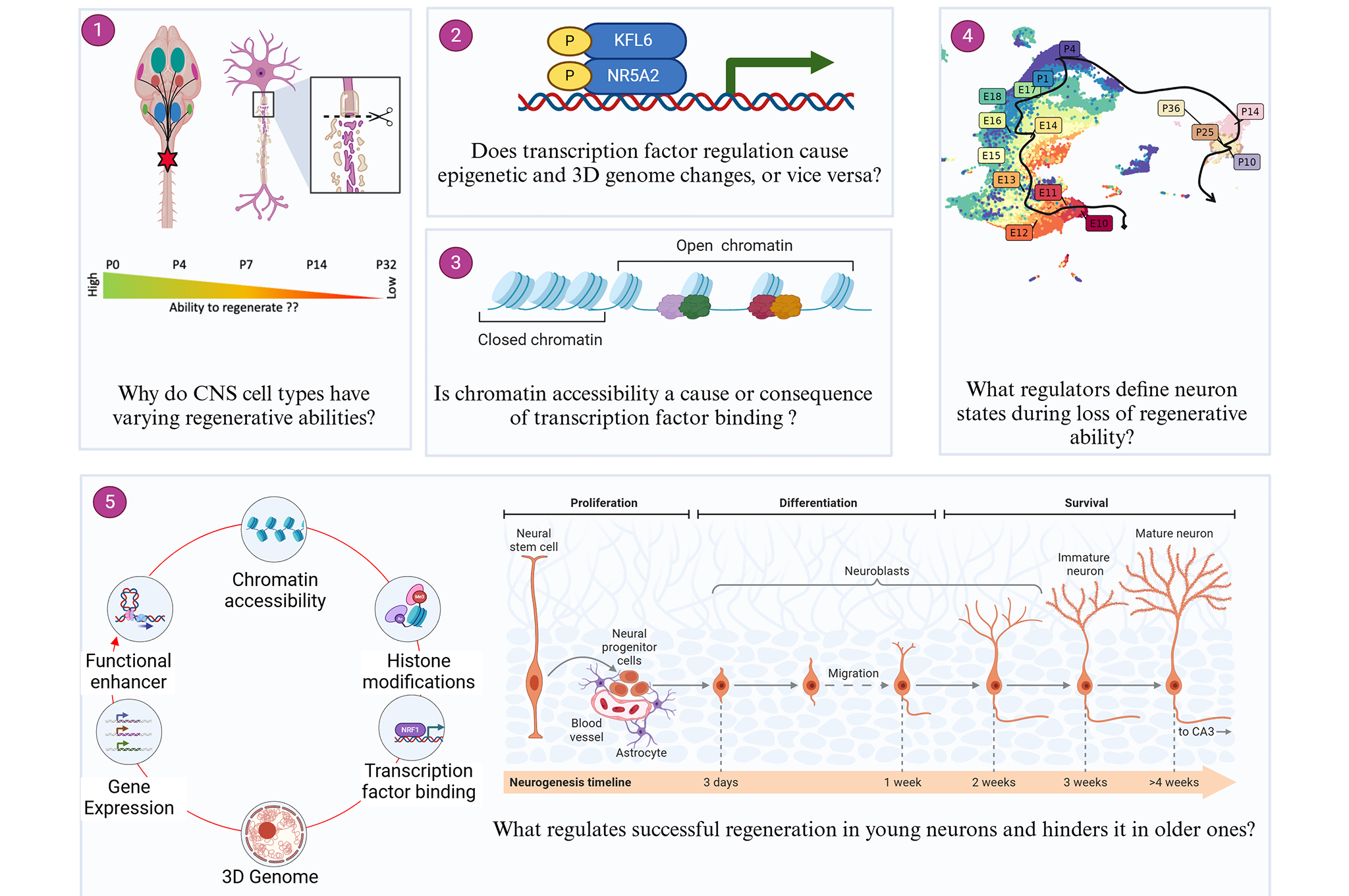 Our research reveals how nerve cell growth genes become restricted during development through two distinct waves of chromatin closure. We found that injuries closer to the brain trigger broader chromatin hanges than distant injuries. Importantly, introducing the PATZ1 transcription factor after injury successfully reopened chromatin and reactivated developmental growth pathways. This work defines the timing of hromatin restriction in CNS neurons and demonstrates it can be reversed to potentially support regeneration.